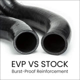 EVP silicone charge tubes can support over 80psi of boost and include quality T-Bolt clamps for a leak-proof connection. Additional features include: